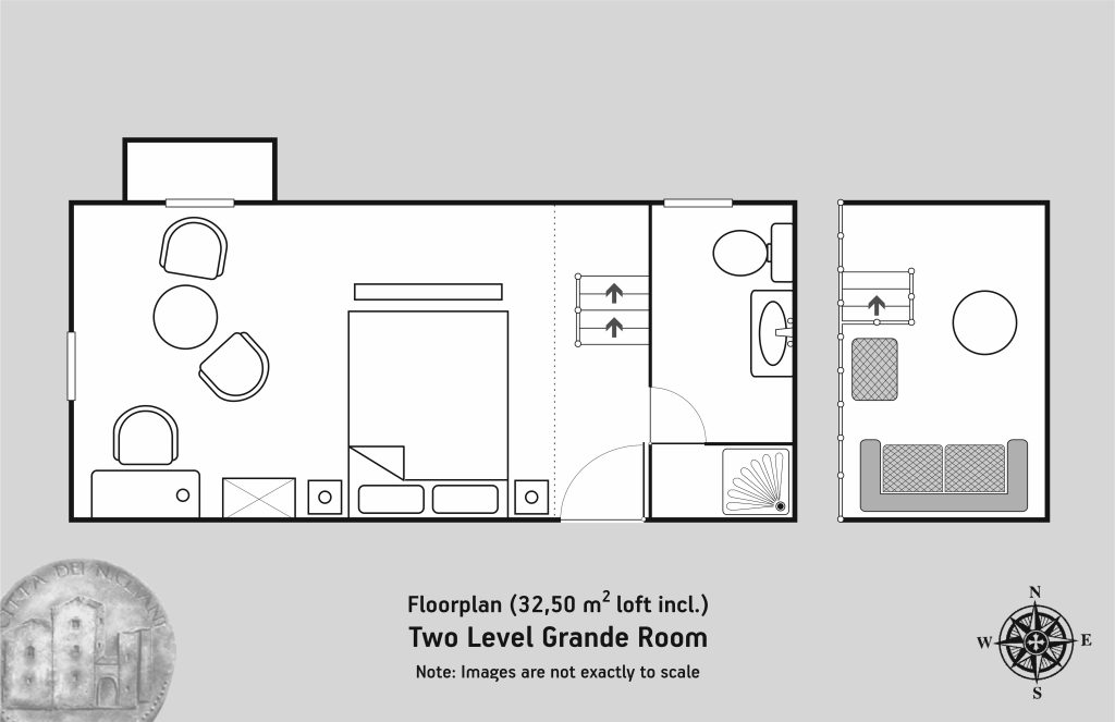 Our largest room offers wonderful relaxation, providing all the elements we are stand out for: romanticism, aesthetic, discreet luxury and harmony. Here, it is obvious the sense of past time, the big oblong and high spaces, the vaulting details and the deeply carved in stone windows. The double bed is placed at the edge of the room, the wooden staircase leading to a traditional loft-reading room with coffee and tea amenities. The engravings by Miltos Pantelias in combination with the stone sculptures by Irini Gonou, compose an ethereal ambience of romance and privacy.